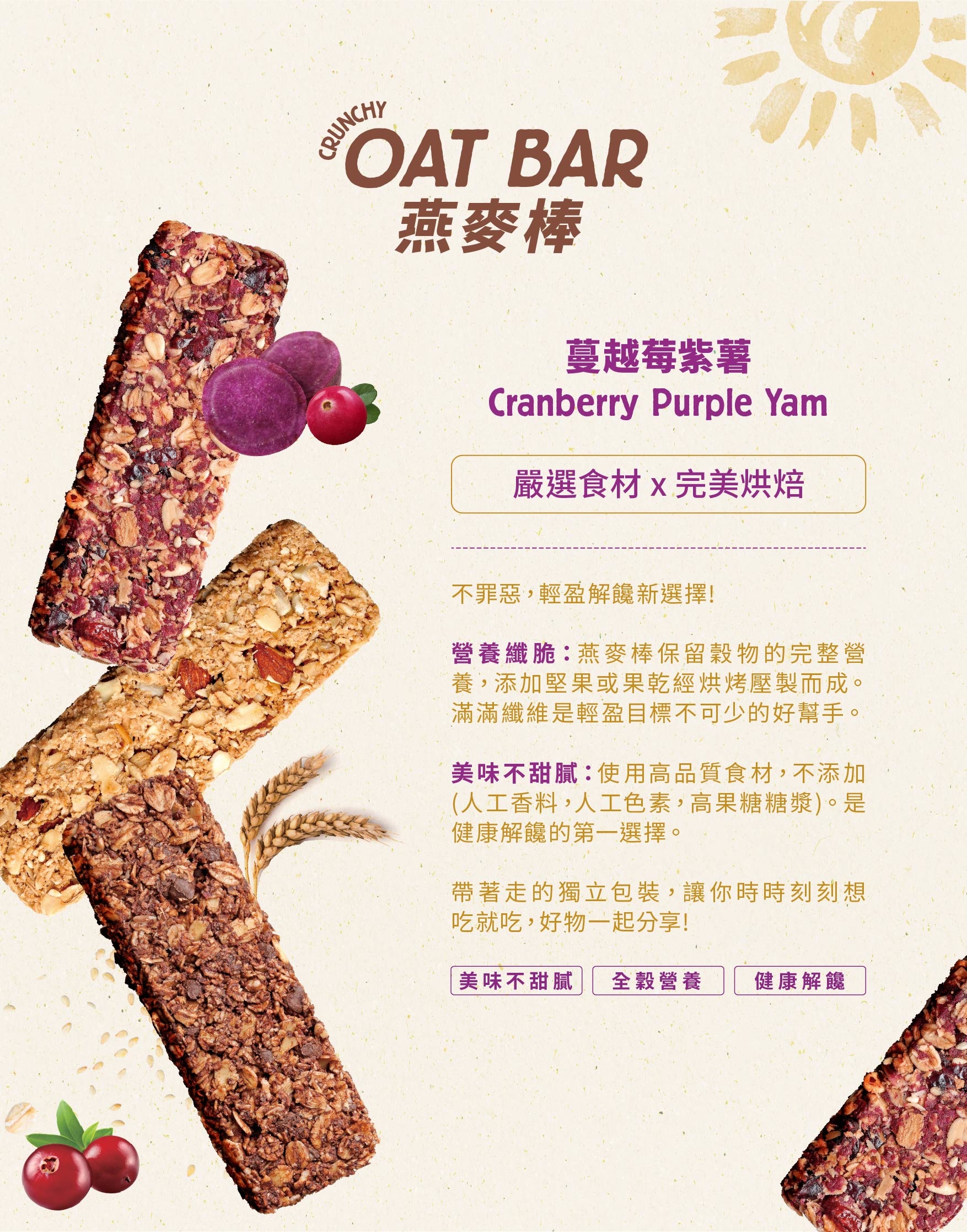 ▶嚴選好食材!選用美國蔓越莓乾,巧妙搭配紫薯雪花片,口感層次豐富